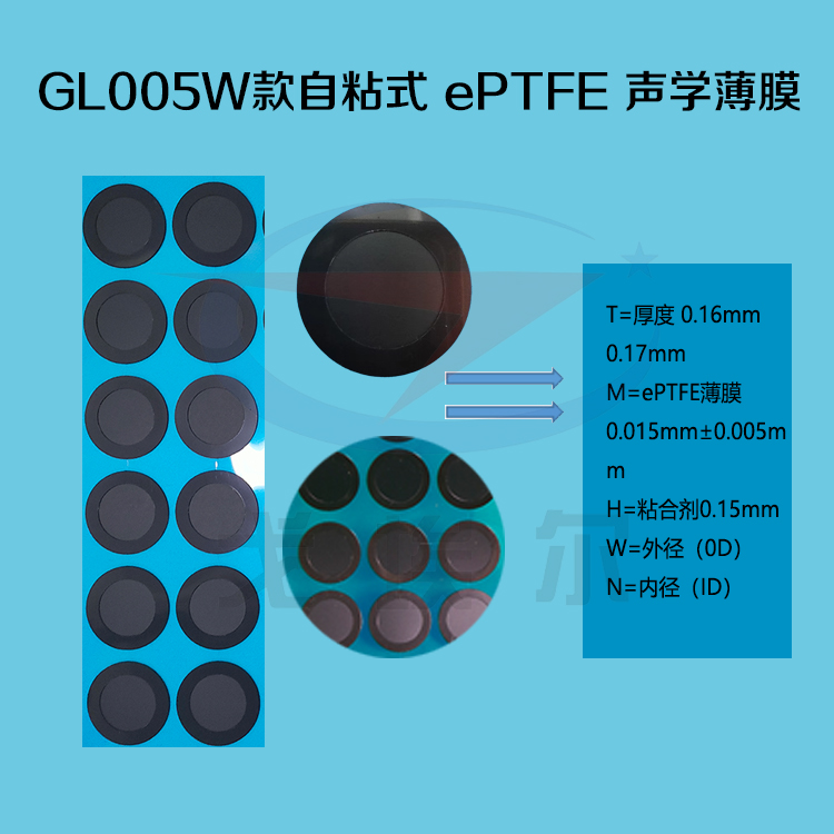 GL005W 是一款自粘式 ePTFE 聲學薄膜。該產品具防水防塵功能,防護等級 IP67,通過其內部的多孔結構實現透氣,調節封閉機殼內部的壓差平衡,同時可以降低聲音傳輸損失,最低<2DB.該產品使用高粘度的粘合劑,使產品穩固的粘合于機殼表面,氣流通過產品中間無膠區域進行交換。